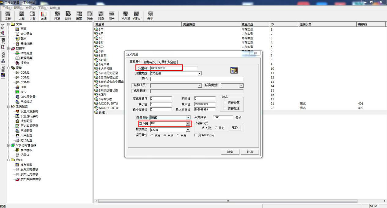 新建變量 MODBUSRTU2,選擇變量類型 IO 整數(shù)。連接設(shè)備為新建的設(shè)備 名:新建 IO 設(shè)備,寄存器 403,代表功能碼為03,起始地址 0 的第三個(gè)值。