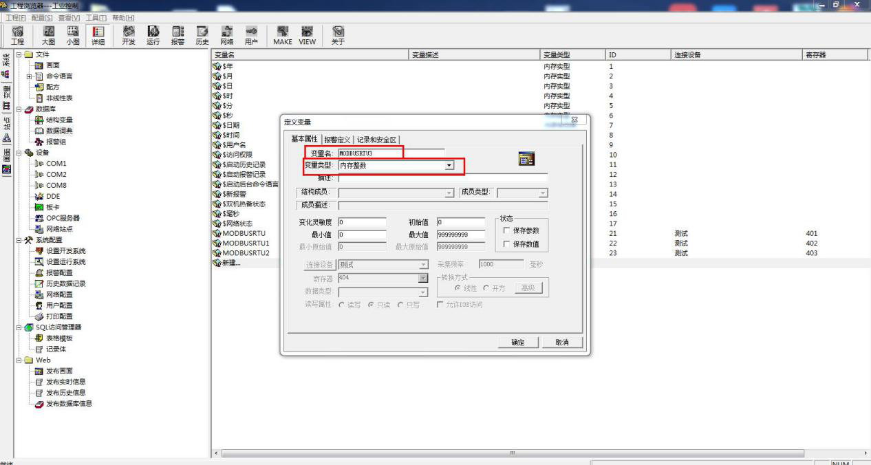 新建變量名 MODBUSRTU3,選擇變量類型內(nèi)存整數(shù)。
