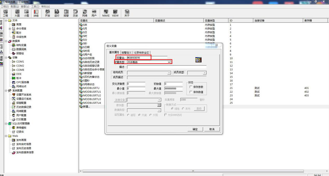 新建變量名 MODBUSRTU5,選擇變量類型內(nèi)存整數(shù)。