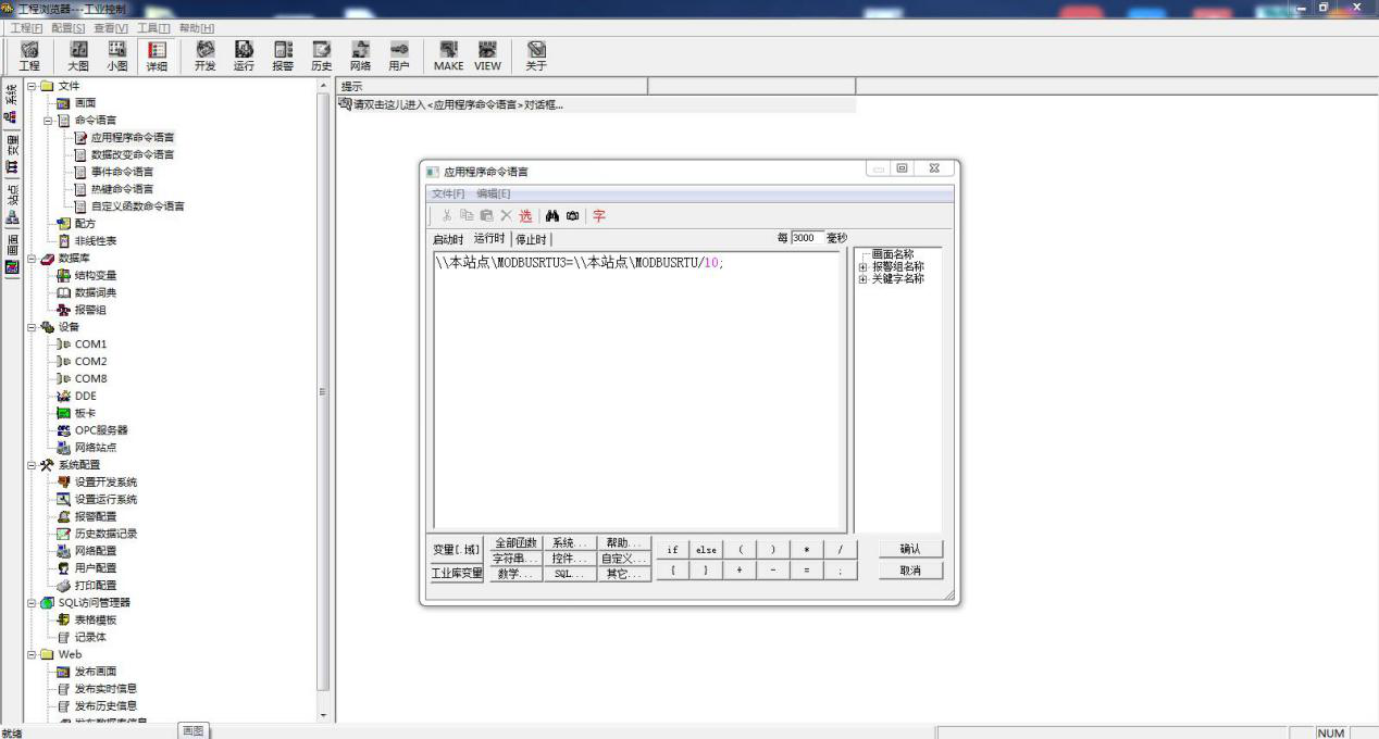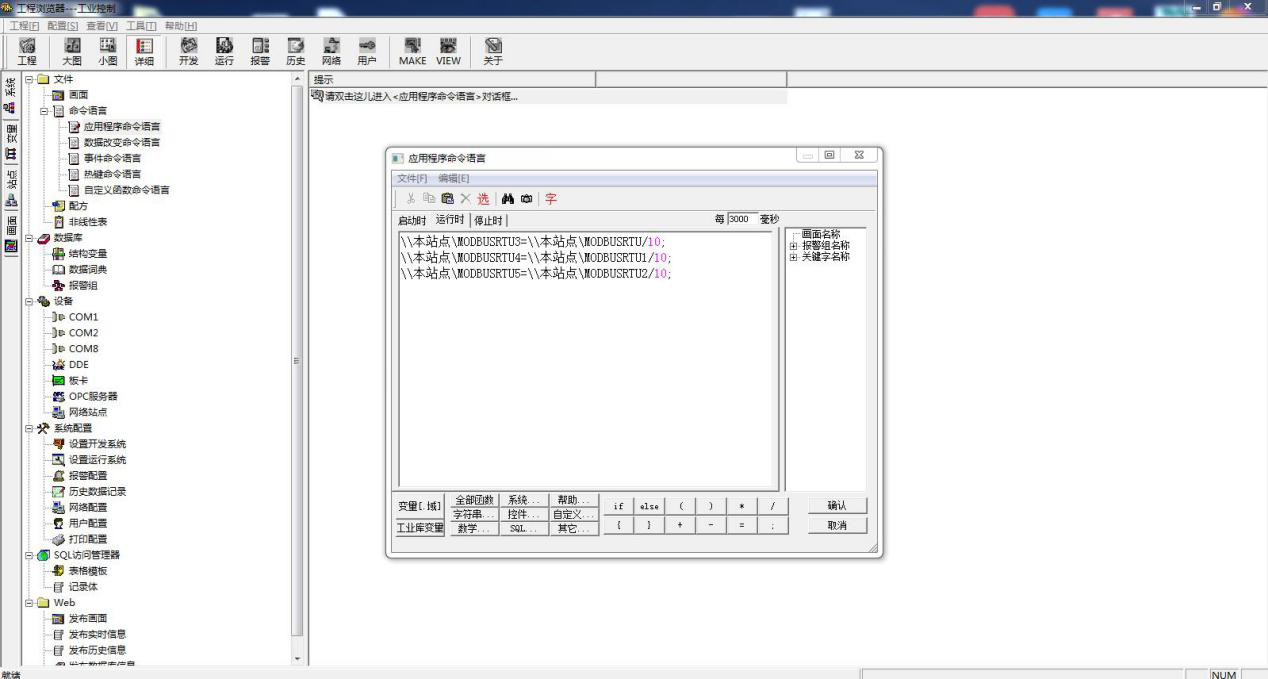 選擇命令語(yǔ)言的應(yīng)用程序命令語(yǔ)言。然后輸入算法,MODBUSRTU 變量名 采集到的數(shù)據(jù)除以 10,然后將數(shù)據(jù)賦值給 MODBUSRTU3,此變量對(duì)應(yīng)的是實(shí) 際的串口設(shè)備寄存器0地址中數(shù)據(jù)值。MODBUSRTU1 變量名采集到的數(shù)據(jù)除以 10,然后將數(shù)據(jù)賦值給 MODBUSRTU4,此變量對(duì)應(yīng)的是實(shí) 際的串口設(shè)備寄存器1地址中數(shù)據(jù)值。MODBUSRTU2 變量名采集到的數(shù)據(jù)除以 10,然后將數(shù)據(jù)賦值給 MODBUSRTU5,此變量對(duì)應(yīng)的是實(shí) 際的串口設(shè)備寄存器1地址中數(shù)據(jù)值。