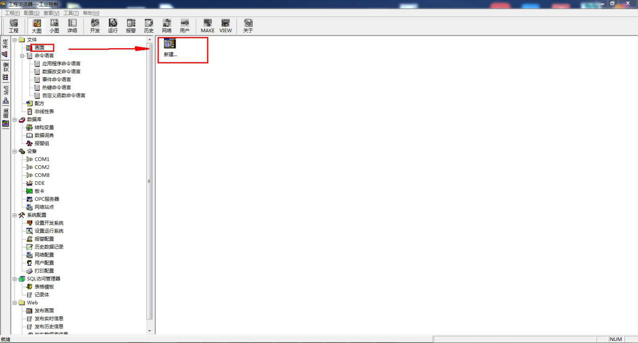 點(diǎn)擊畫面,新建一個(gè)畫面。畫面命名.然后雙擊,進(jìn)入畫面編輯欄