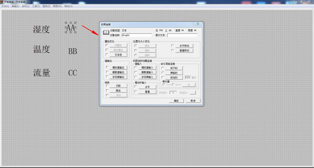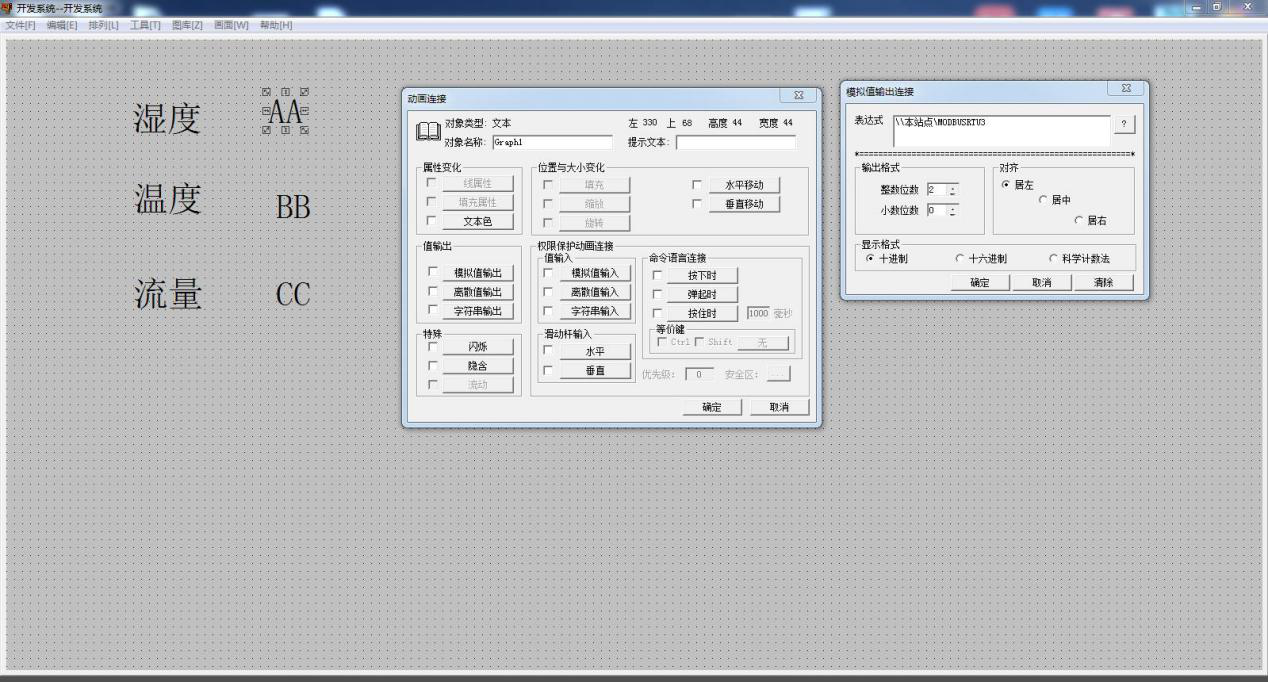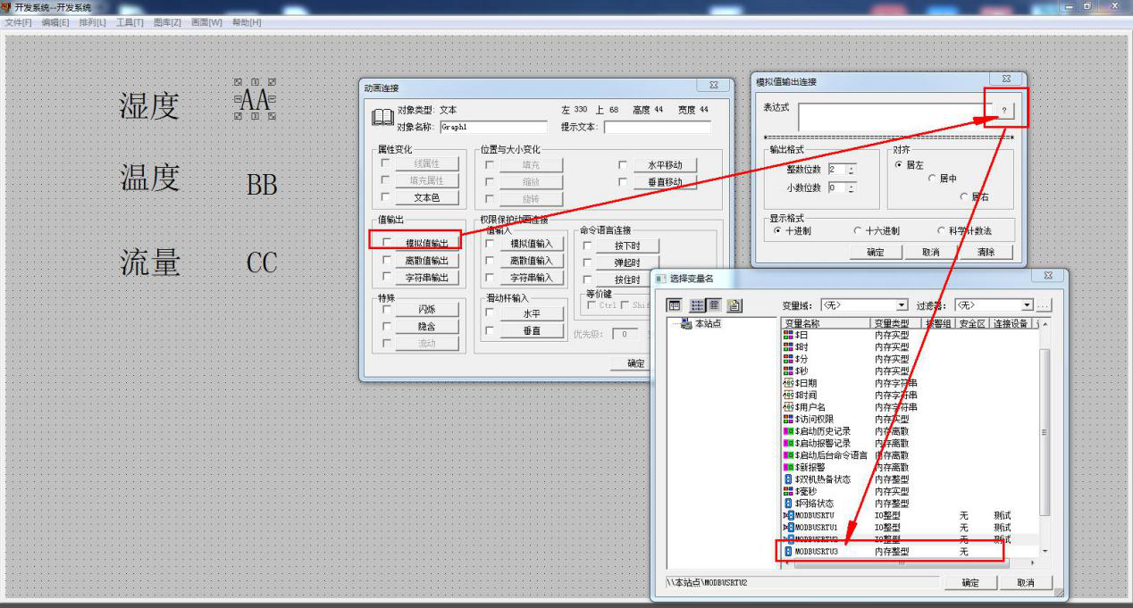 雙擊其中一個(gè)文本 AA,然后點(diǎn)擊模擬值輸出,在表達(dá)式內(nèi)選擇變量名 為 MODBUSRTU3,然后確定。意思是MODBUSRTU3 的值是設(shè)備寄存器地址0中的數(shù)據(jù)值,然后將數(shù)值 傳到畫面AA