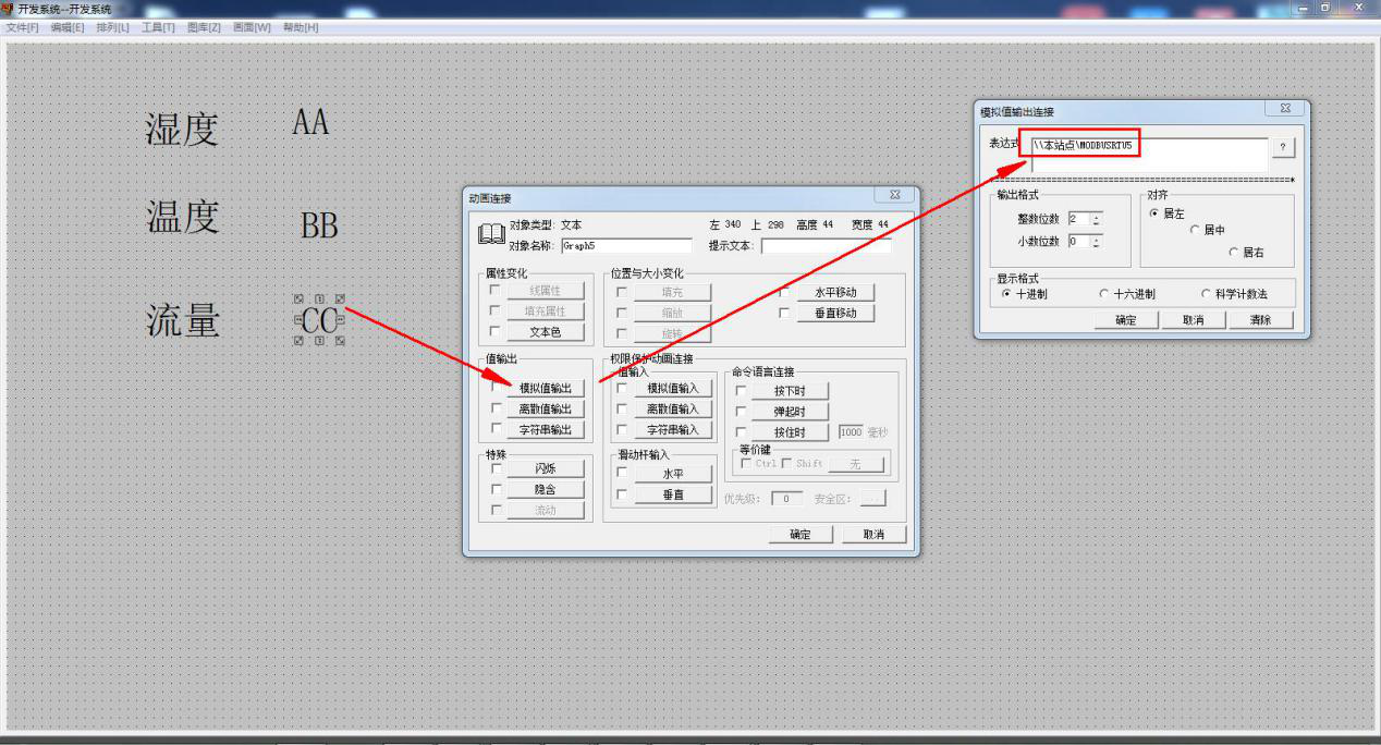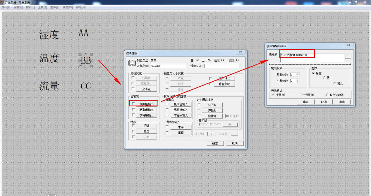 雙擊其中一個(gè)文本 BB,然后點(diǎn)擊模擬值輸出,在表達(dá)式內(nèi)選擇變量名 為 MODBUSRTU4,然后確定。意思是MODBUSRTU4 的值是設(shè)備寄存器地址1中的數(shù)據(jù)值,然后將數(shù)值 傳到畫面BB