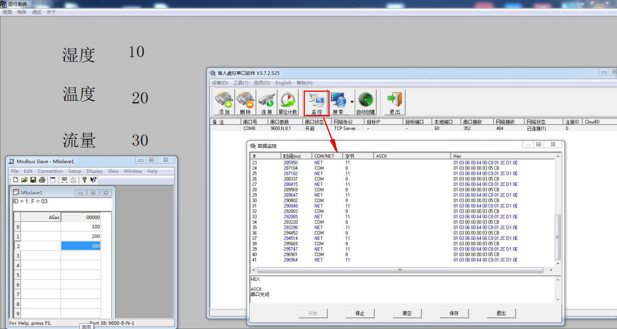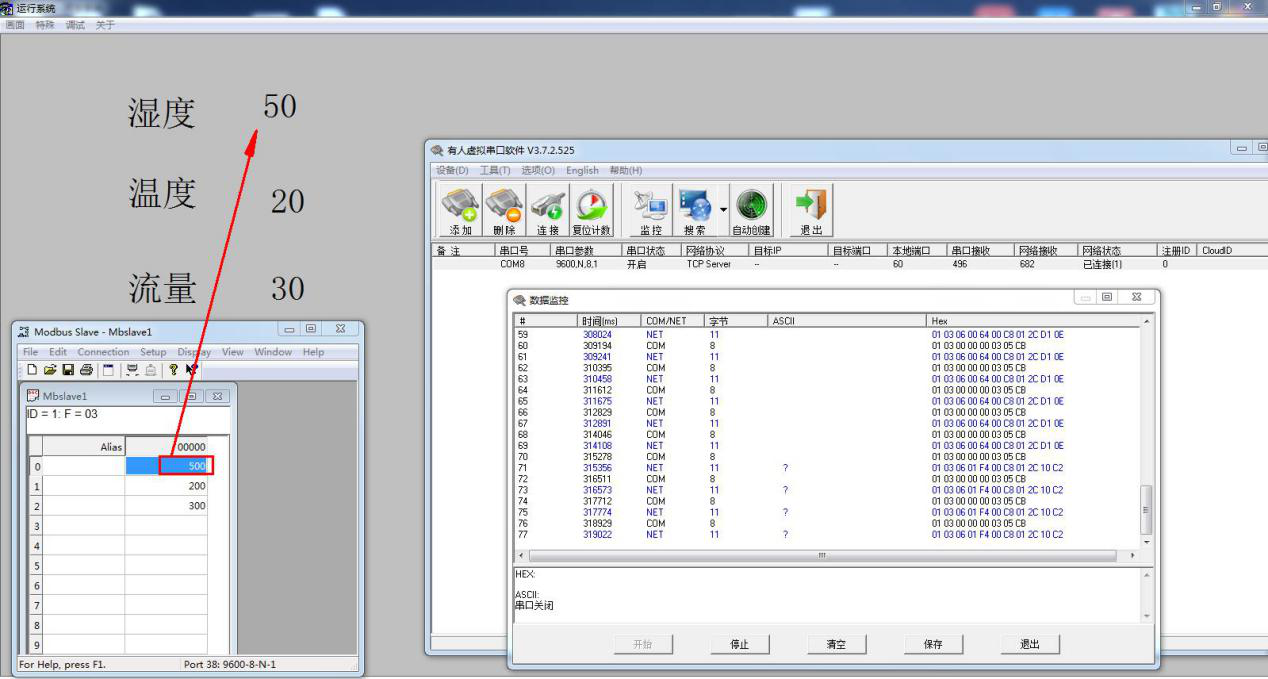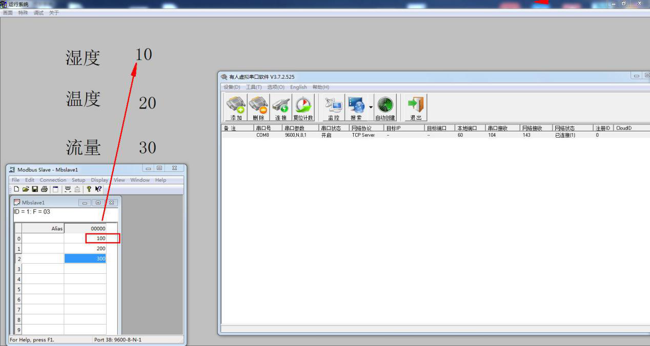 MODBUS SLAVE軟件修改3個(gè)寄存器地址數(shù)據(jù),組態(tài)王讀取到串口設(shè)備3個(gè)寄存器地址數(shù)據(jù),在頁(yè)面上顯示。