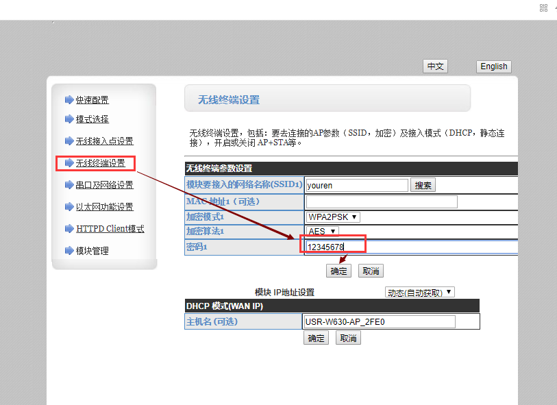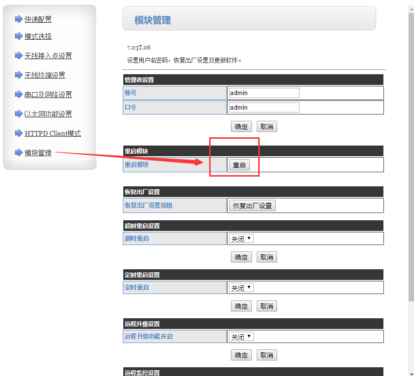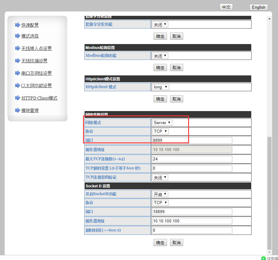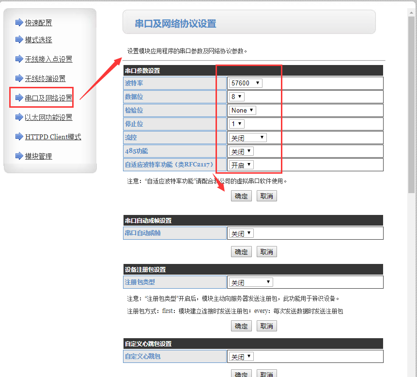 4、模式選擇: STA,modbus rtu<=>modbus tcp協(xié)議轉(zhuǎn)換。 注:確定后,不用立刻重啟,等著全部修改完成一塊重啟。