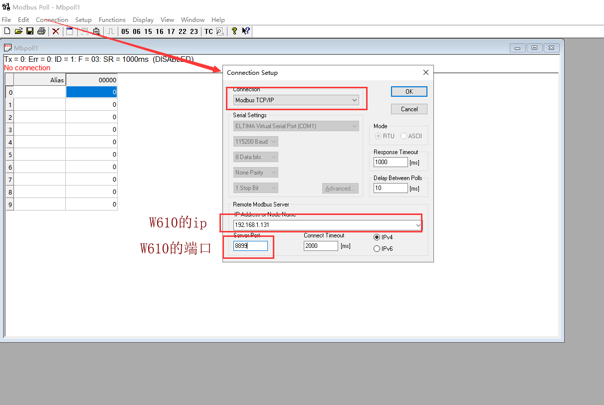 10、打開modbus poll和modbus slave軟件,分別設(shè)置參數(shù),選擇modbus tcp/ip協(xié)議,然后連接W610的端口和ip;