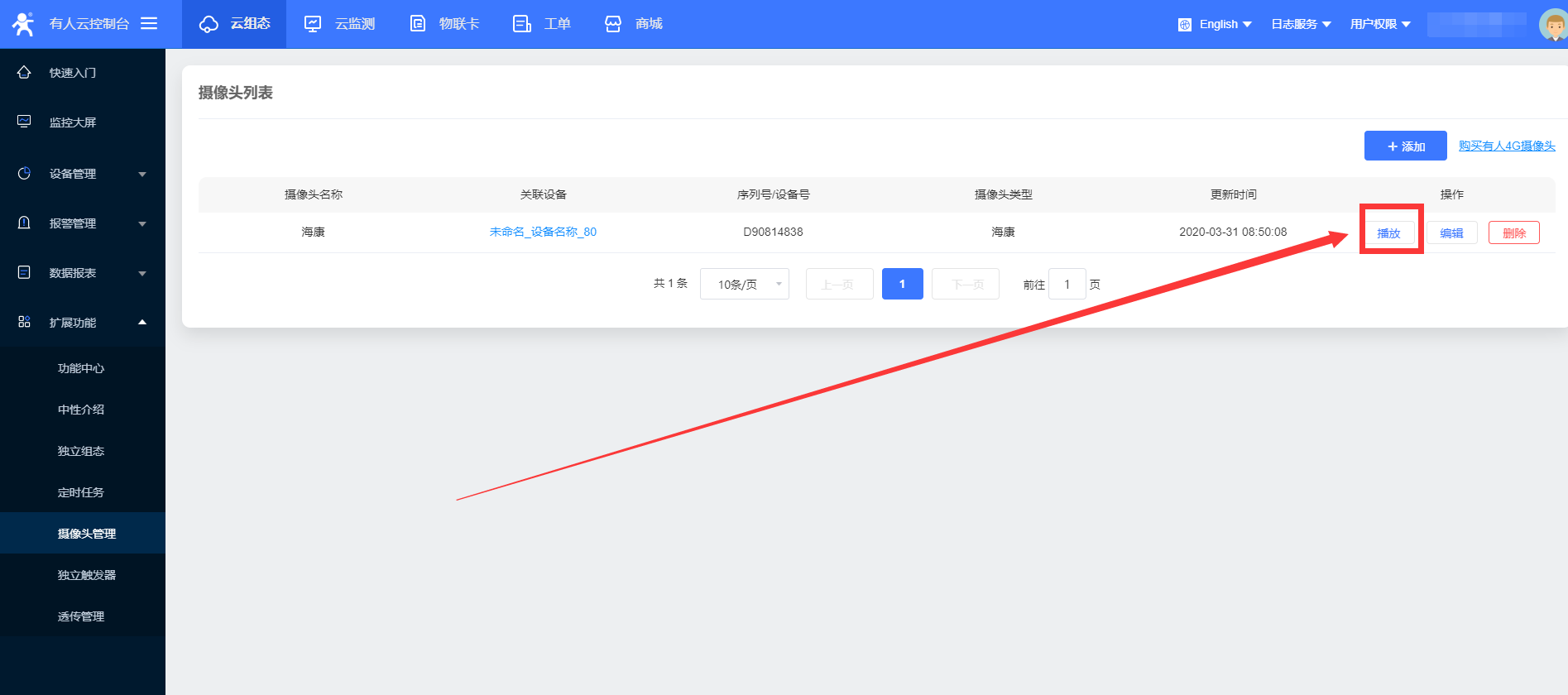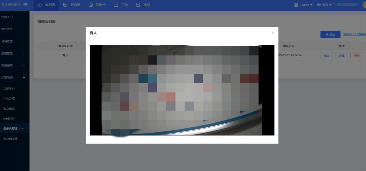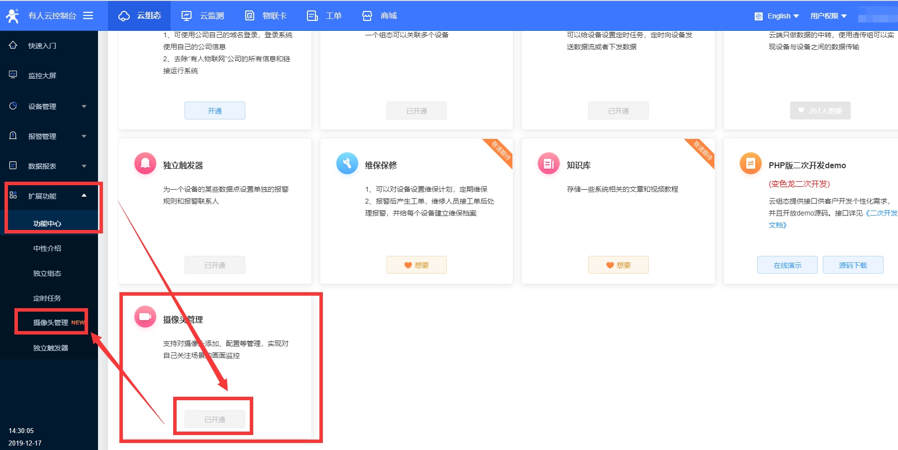1、在擴(kuò)展功能的功能中心將攝像頭管理功能開通,左側(cè)列表生成該選項(xiàng)欄,點(diǎn)擊進(jìn)入攝像頭管理