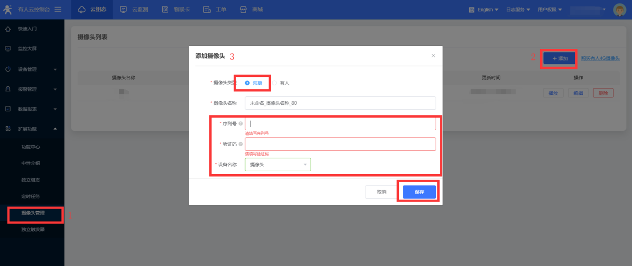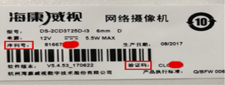 2、點(diǎn)擊添加鍵,選擇??禂z像頭,序列號(hào)為攝像頭機(jī)身上的9位序列號(hào),驗(yàn)證碼為攝像頭機(jī)身上的6位驗(yàn)證碼,如下圖所示,保存