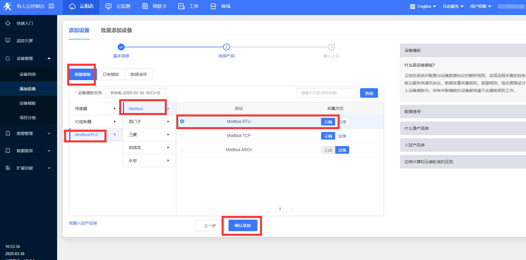 3、選擇協(xié)議這里,可以隨意選擇,這里選的是 modbus rtu 云端