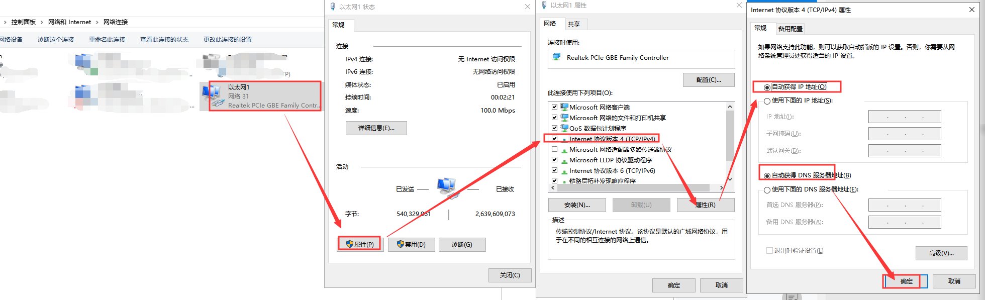 打開網絡共享中心,雙擊對應的網絡適配器,點擊屬性,選擇IPV4,點擊屬性,修改電腦為自動獲取IP,然后點擊確定。(如果電腦本來就是自動獲取IP,這一步可以跳過)點擊詳細信息可以查看到電腦獲取的IP地址: