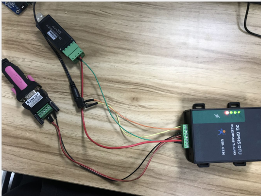 (1) 硬件連接:裝上sim卡,接上天線,G726的串口通過USB轉(zhuǎn)RS232或者USB轉(zhuǎn)RS485接到PC上,用我司提供的適配器供電。帶白條的那根線是正極,帶字母的那根線是負(fù)極。如下圖所示。(圖中連接了232和485,客戶在實(shí)際測試中只需要連接232或者485二選一即可)