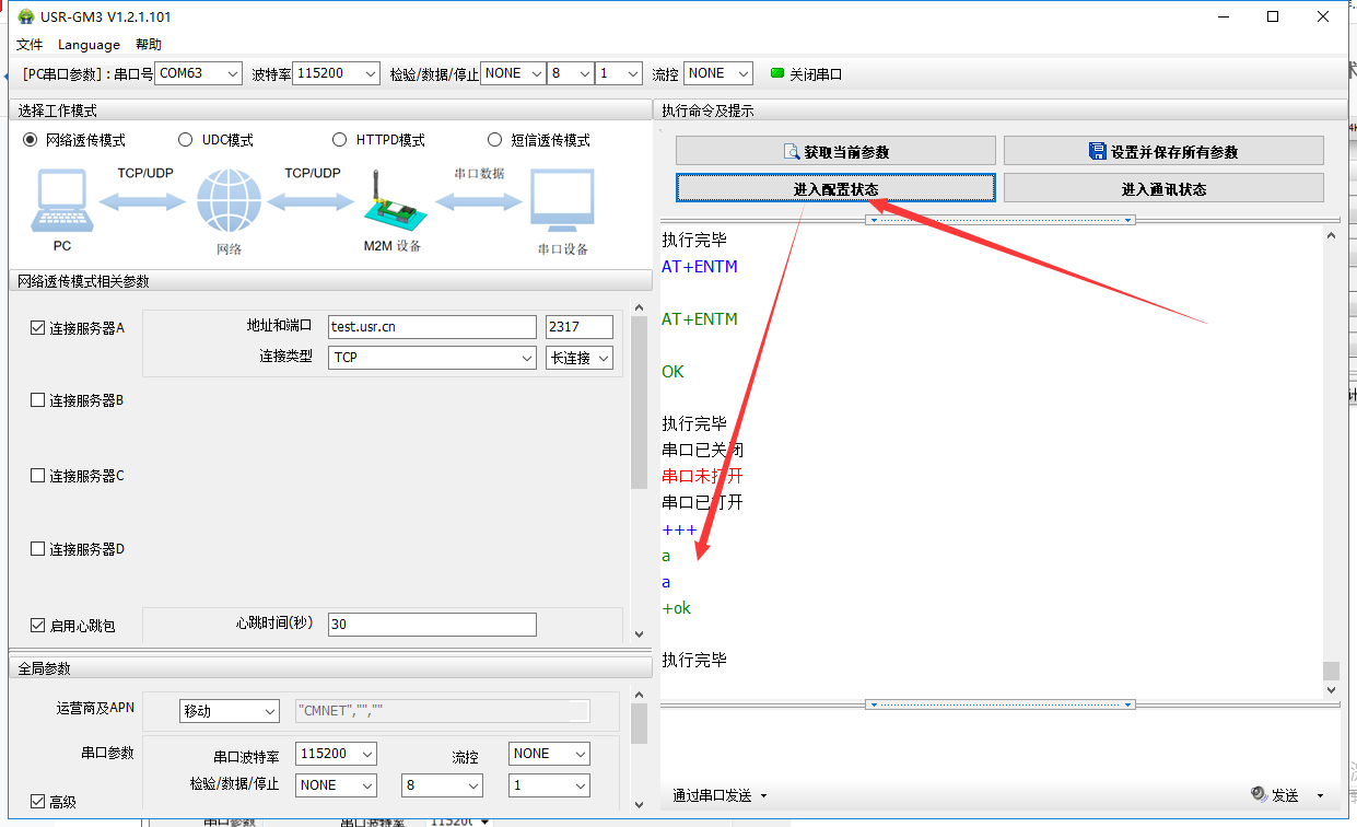 的命令,點(diǎn)擊進(jìn)入通信狀態(tài)(多次間隔 2 秒嘗試),若能返回 ok,則證明之前在 AT 指令配