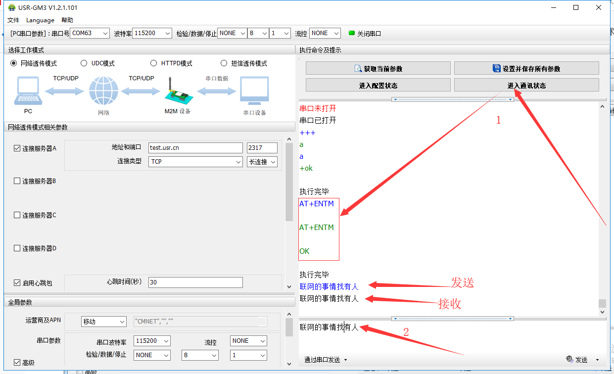 (5)DTU出廠默認(rèn)連接的是我司的測試服務(wù)器:test.usr.cn:2317;串口向服務(wù)器發(fā)送什么數(shù)據(jù),服務(wù)器就將接收到的數(shù)據(jù)返回到串口。