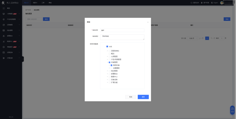 2、登錄有人云控制臺之后,點擊右上角的用戶權(quán)限,點擊角色管理。添加并填寫相關(guān)的角色信息以及菜單應(yīng)用權(quán)限。