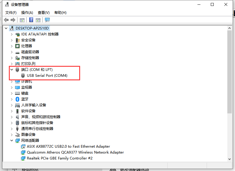 5、在設(shè)備管理器中查看端口信息,確定301串口使用的串口號(hào),如下圖所示電腦端口號(hào)為COM4。