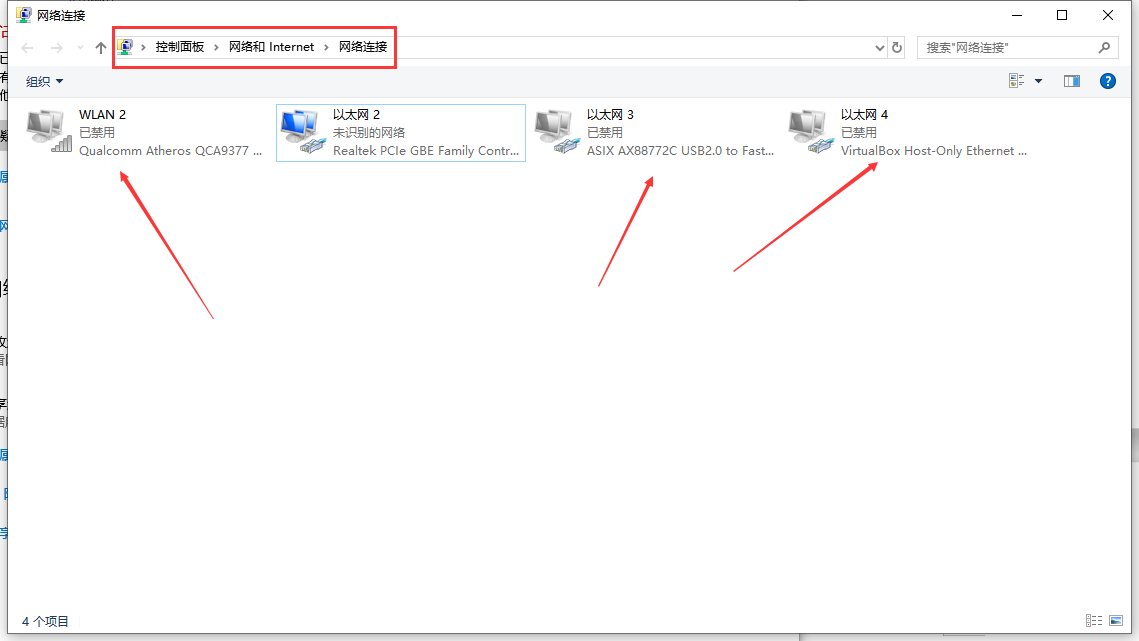 2、按路徑:控制面板--->網(wǎng)絡(luò)和Internet--->網(wǎng)絡(luò)和共享中心找到“windows防火墻”和“更改適配器設(shè)置”選項,關(guān)閉防火墻并禁用與本次測試無關(guān)的網(wǎng)卡。并關(guān)閉電腦殺毒軟件。