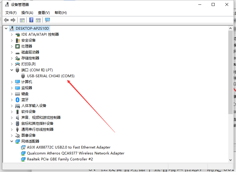 5、在設(shè)備管理器中查看端口信息,確定301串口使用的串口號,如下圖所示電腦端口號為COM5。