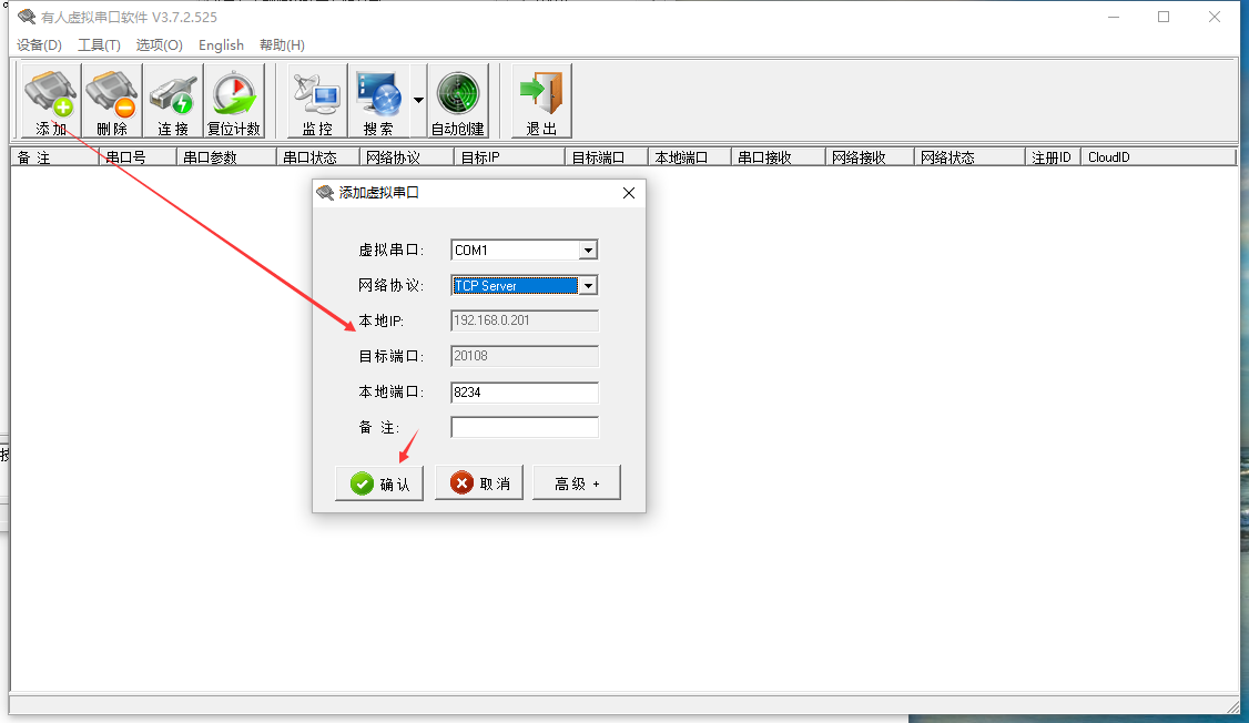 打開虛擬串口軟件,點(diǎn)擊“添加”在彈出的窗口中設(shè)置虛擬串口信息,由于上述301設(shè)備采用TCP Client協(xié)議,所以此處網(wǎng)絡(luò)協(xié)議設(shè)置為TCP Server。目標(biāo)IP和目標(biāo)端口設(shè)置為301的IP和端口。然后點(diǎn)擊“確定”,建立虛擬串口COM1。
