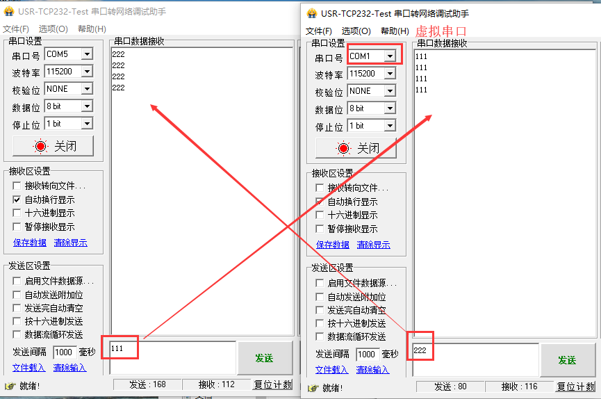 8、打開兩個USR_TCP232_Test軟件,一個連接COM4,一個連接虛擬串口COM1,實(shí)現(xiàn)兩個串口直接數(shù)據(jù)互發(fā)。