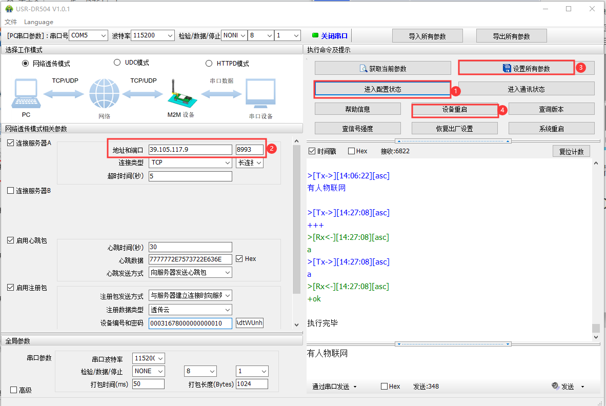 打開(kāi)串口--->進(jìn)入配置狀態(tài)--->成功的話(huà),會(huì)返回執(zhí)行完畢--->修改服務(wù)器地址和端口--->設(shè)置并保存參數(shù)--->模塊重啟
