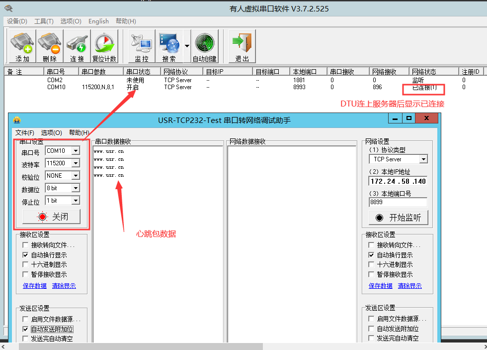 DTU串口和虛擬串口雙向數(shù)據(jù)收發(fā)結(jié)果見(jiàn)下圖