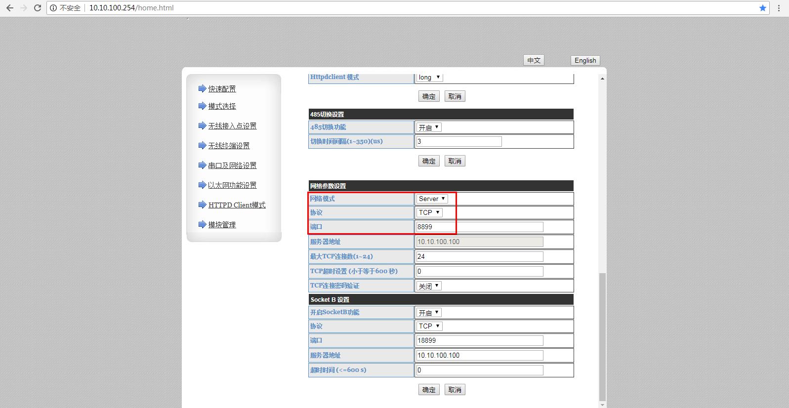 網絡參數(shù)默認是TCP server工作模式,端口是8899。