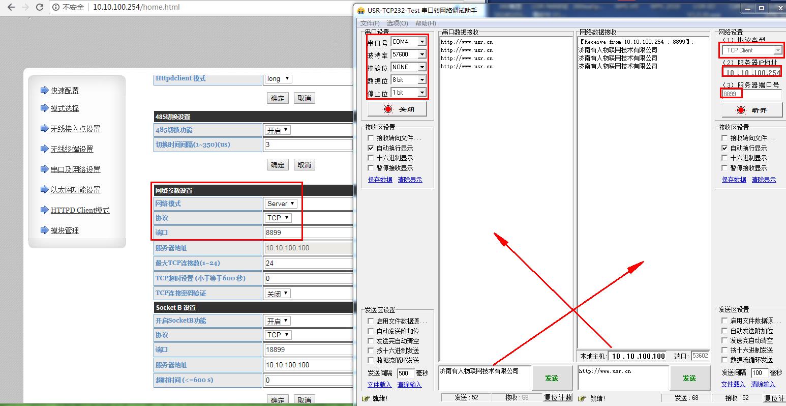 打開USR-TCP232-TEST網絡助手,左側串口部分用COM4打開,串口參數(shù)和DR404設置一致,網絡端設置TCP client,客戶端,服務器IP填DR404的IP,服務器的端口填8899。