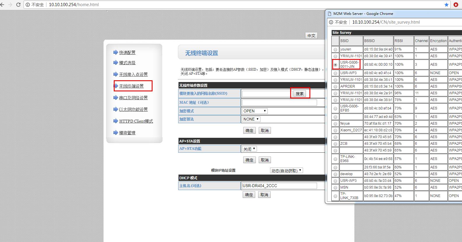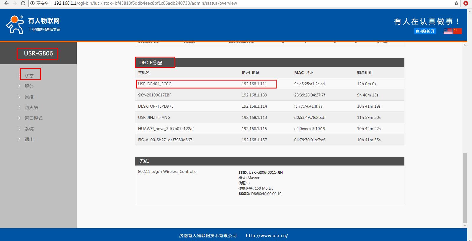 STA模式設(shè)置成功之后,電腦無線連接USR-G806的wifi,用路由器IP登錄路由器網(wǎng)頁。