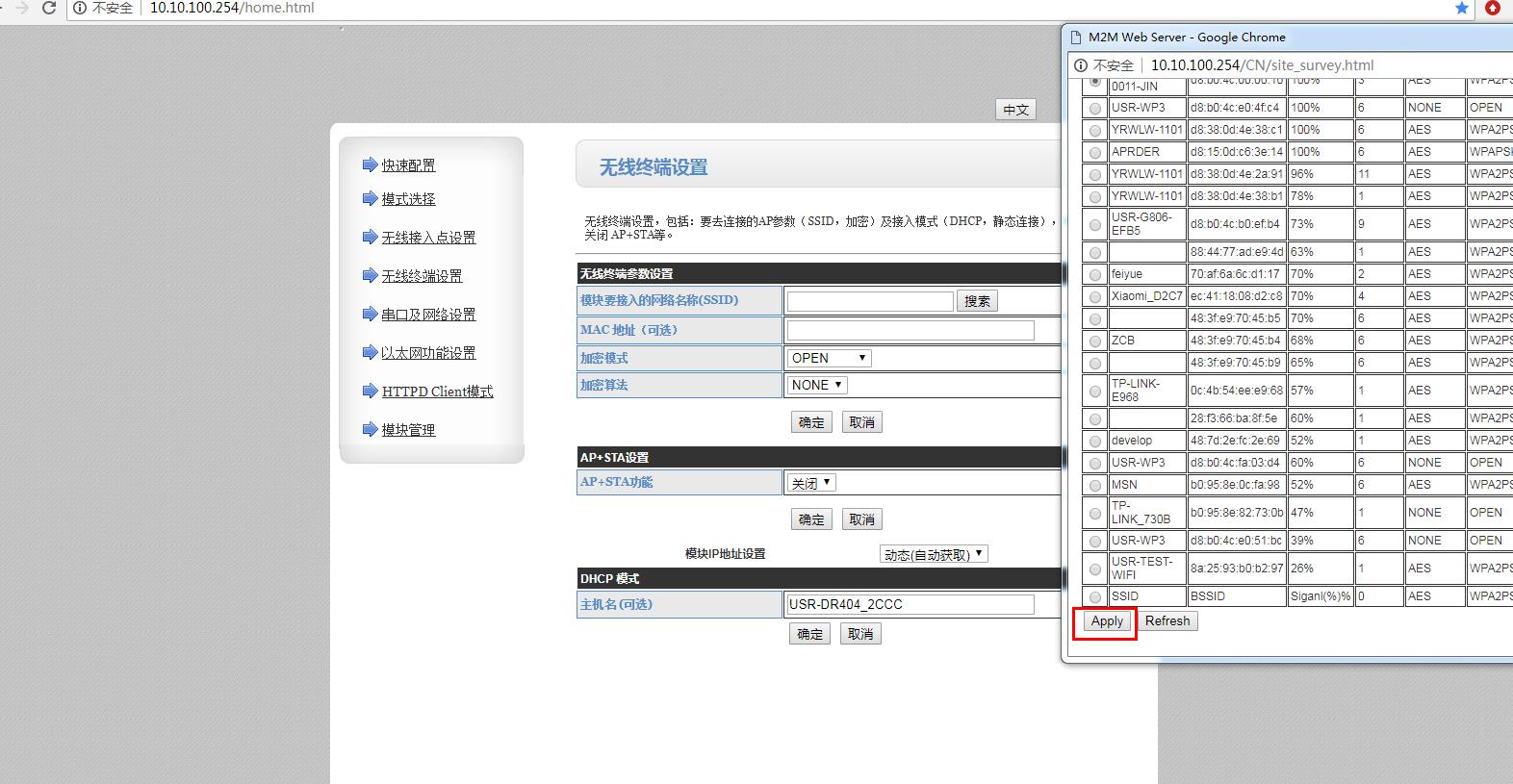 在網(wǎng)頁無線終端設(shè)置,點(diǎn)擊搜索,搜索要連接路由器的wifi名稱,選中,點(diǎn)擊APPLY