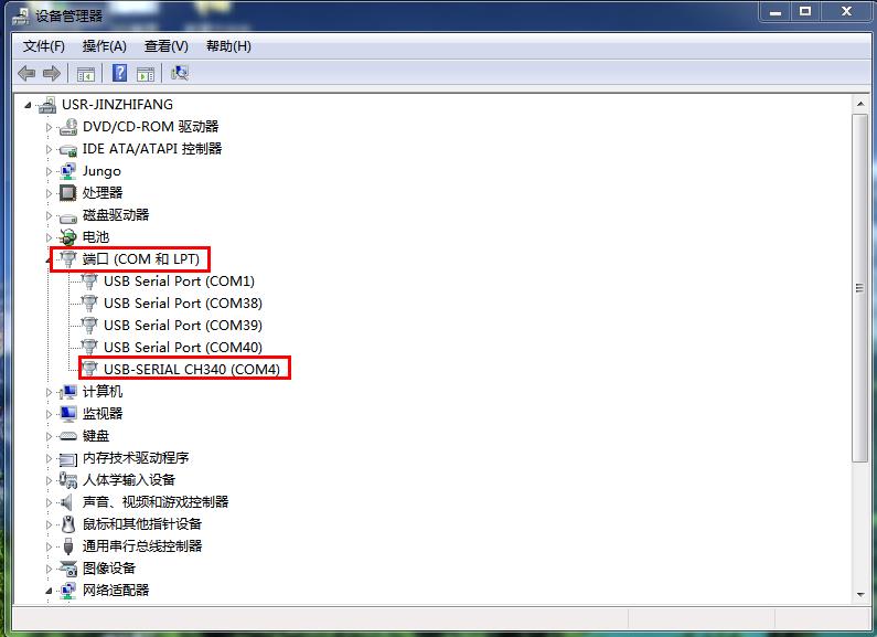 將USB-RS485串口線接電腦USB口,在電腦上設(shè)備管理器中,查看USB-RS485線的串口號,是COM4。