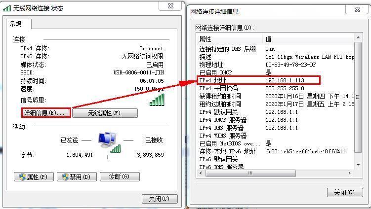 電腦連接USR-G806的wifi,查看無線網(wǎng)絡(luò)狀態(tài),電腦的IP,192.168.1.113。