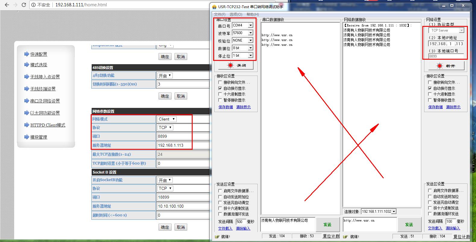 然后用USR-TCP232-TEST網(wǎng)絡(luò)助手測試串口和網(wǎng)絡(luò)之間的數(shù)據(jù)傳輸。