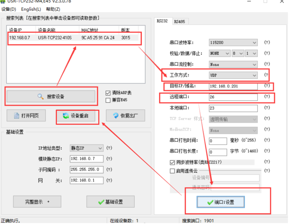 2. 打開(kāi)設(shè)置軟件USR-TCP232-M4-setup-V2.3.3.97,選擇232的串口進(jìn)行參數(shù)的配置,選中完后,設(shè)置相關(guān)的參數(shù):工作方式設(shè)置為“UDP”,然后將目標(biāo)的IP為:“192.168.0.201”然后將遠(yuǎn)程端口設(shè)置為“26”.點(diǎn)擊端口一設(shè)置,然后點(diǎn)擊設(shè)備重啟。
