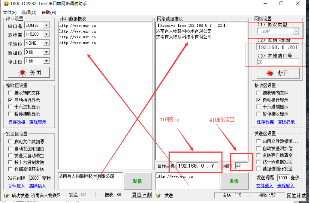 3. 打開(kāi)測(cè)試軟件:USR-TCP232-Test-V1.3(小黃人),串口號(hào)可以在設(shè)備管理器中查詢,然后協(xié)議選擇UDP,本地端口寫(xiě)成“192.168.0.201”端口號(hào)是“26”點(diǎn)擊打開(kāi)連接。下面會(huì)出現(xiàn)連接對(duì)象。即可相互發(fā)送數(shù)據(jù)。如圖: