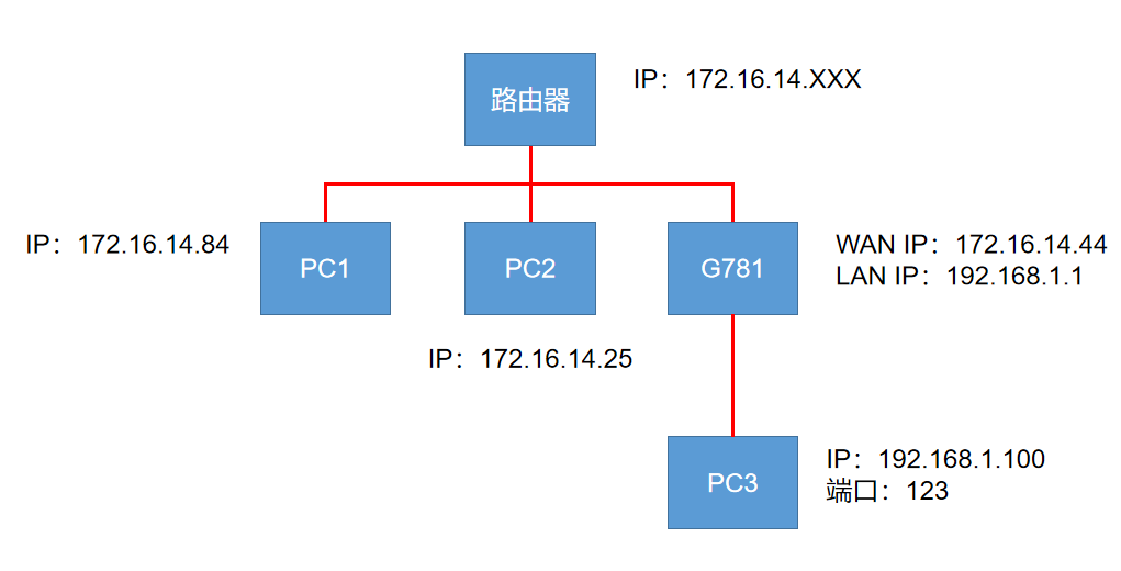 在G781中做端口轉(zhuǎn)發(fā),允許除PC2的設(shè)備訪問(wèn)PC3的123端口