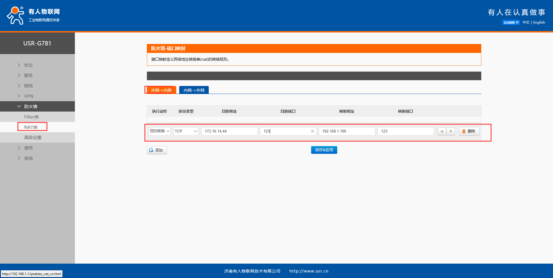 1、進(jìn)入G781的內(nèi)置網(wǎng)頁(yè),在防火墻的nat表中設(shè)置端口轉(zhuǎn)發(fā):