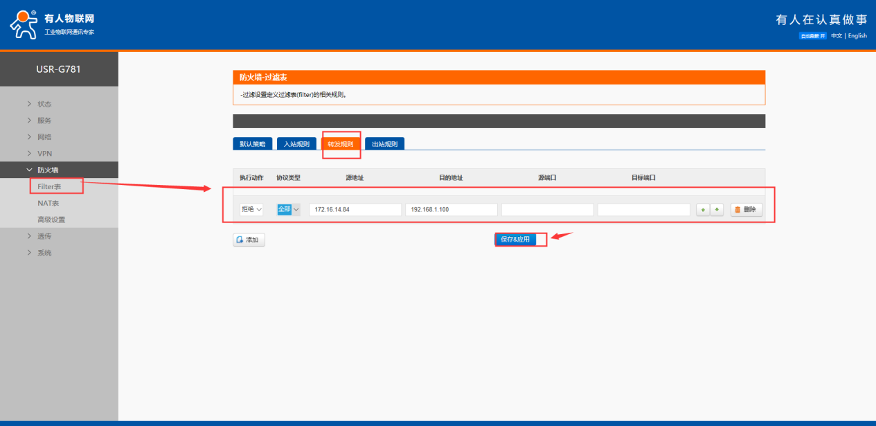 2、設(shè)置轉(zhuǎn)發(fā)規(guī)則,在防火墻---Filter表----轉(zhuǎn)發(fā)規(guī)則中設(shè)置