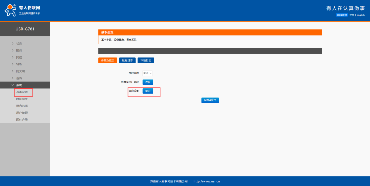 3、設(shè)置完成后,在系統(tǒng)---基本設(shè)置界面點(diǎn)擊重啟按鈕,重啟G781.