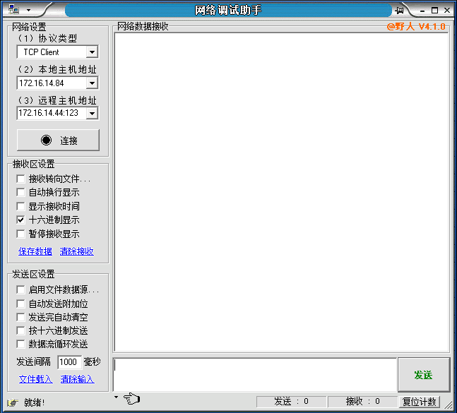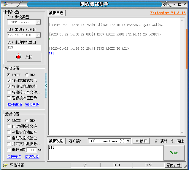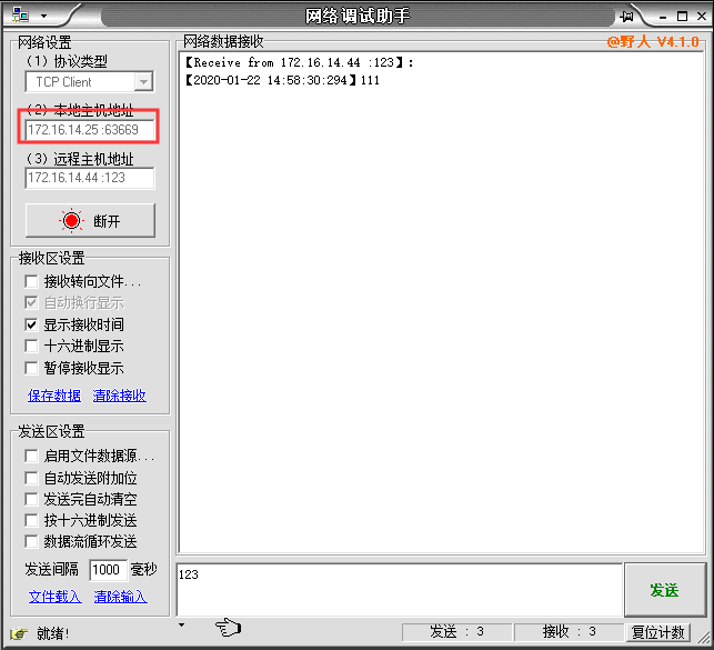 4、在PC2上打開(kāi)網(wǎng)絡(luò)調(diào)試助手連接PC3,如下圖可以正確連接上,并能夠和PC3互相首發(fā)數(shù)據(jù)。