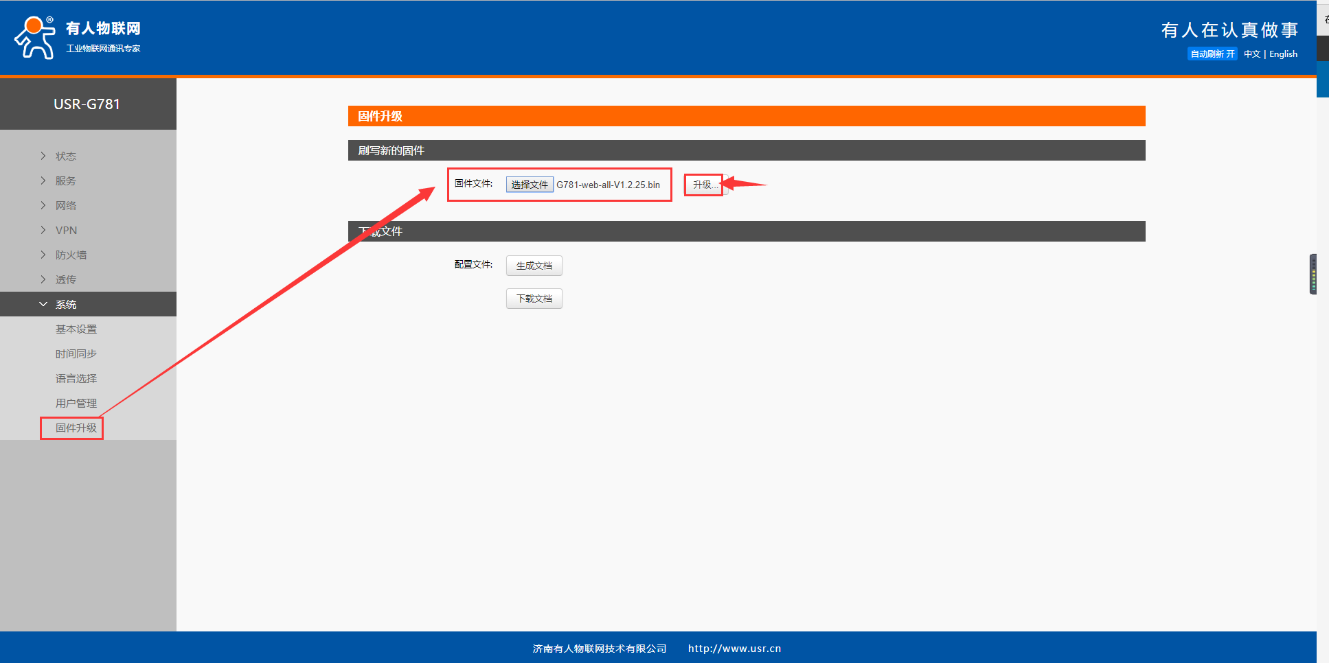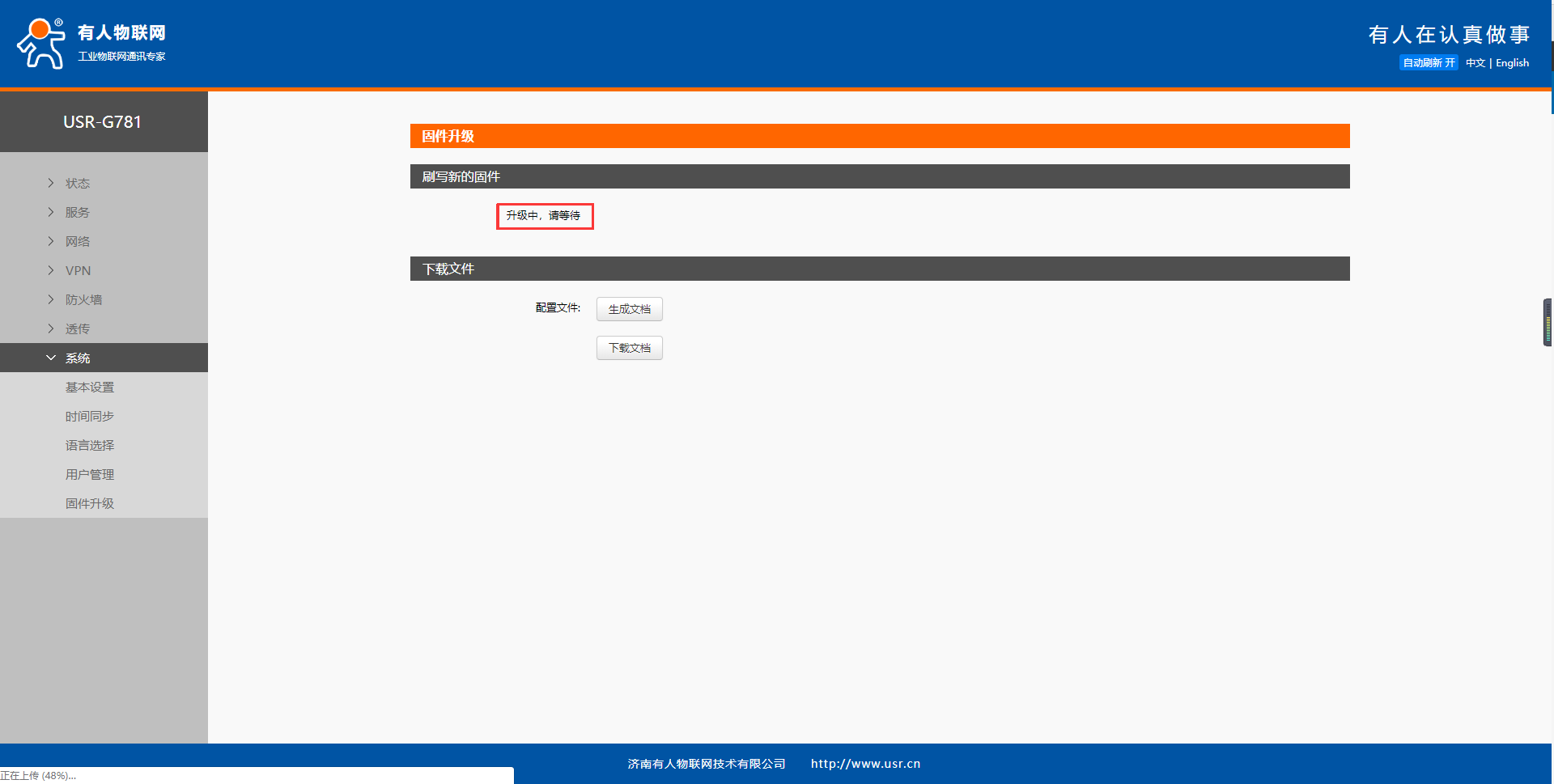 4、 進入系統(tǒng)----固件升級界面,選擇對應(yīng)的固件文件(請登錄http://h.usr.cn/提交工單并備注當(dāng)前固件版本和郵箱地址,技術(shù)支持會將固件文件發(fā)送至您的郵箱),點擊升級,會提示正在升級。此時不要重啟設(shè)備,不要斷電,耐心等待約一分鐘左右。設(shè)備升級固件完成后會自動重啟(可觀察指示燈)。
