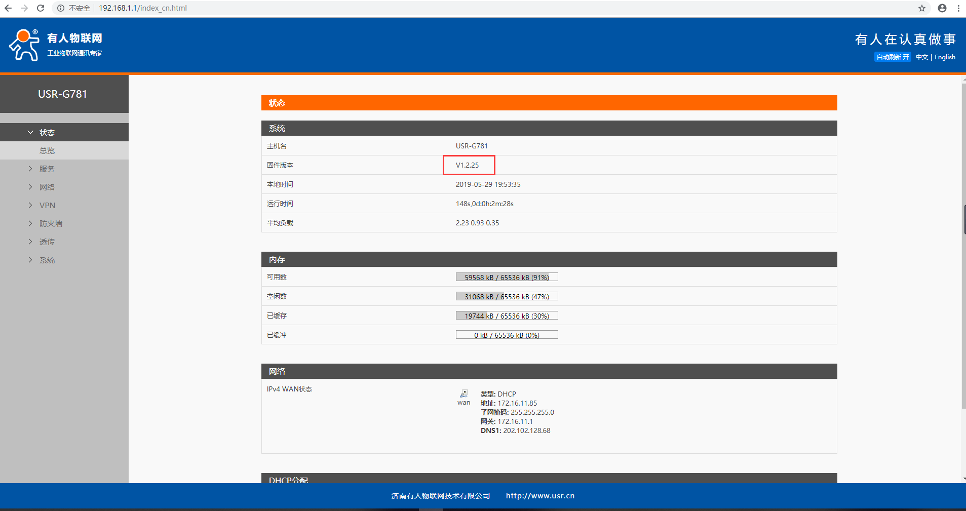 5、 等待設(shè)備升級固件完畢自動重啟完成后,重新進入配置網(wǎng)頁,可在狀態(tài)總覽頁面查看到固件版本已經(jīng)更改