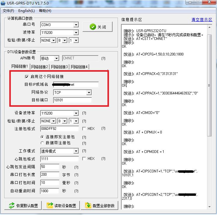 8、 設(shè)置DTU目的地址和端口號: