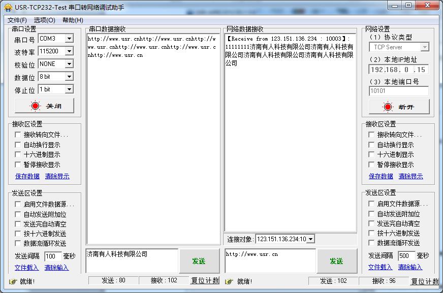 9、 通過調(diào)試助手建立TCPSERVER,串口和網(wǎng)絡(luò)端分別發(fā)送數(shù)據(jù)來測試: