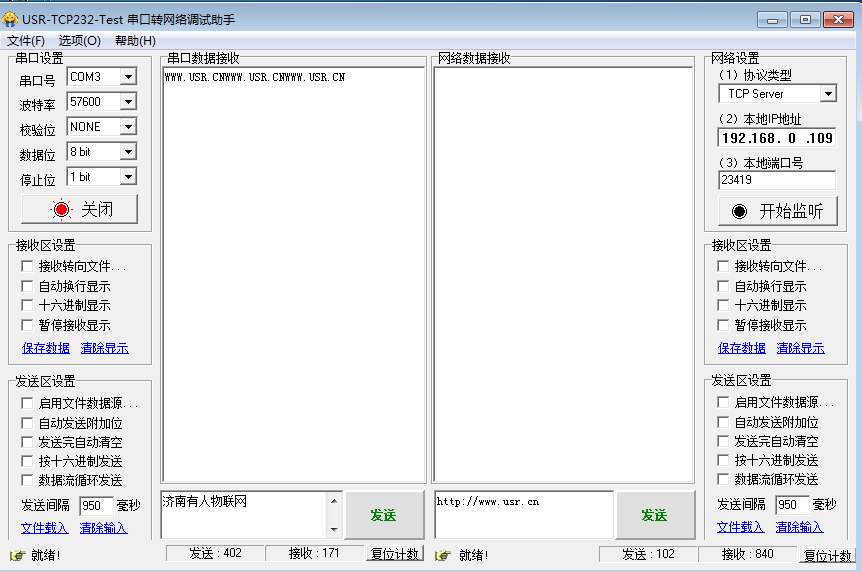 在電腦端的串口助手發(fā)送 濟(jì)南有人物聯(lián)網(wǎng), 手機(jī)端能夠收到數(shù)據(jù)。