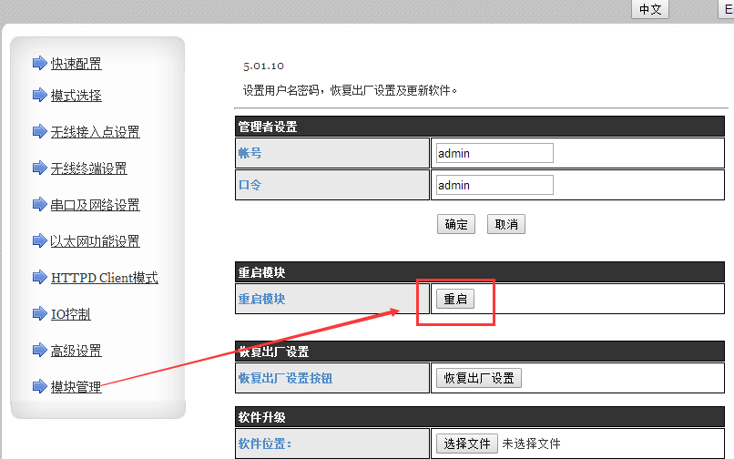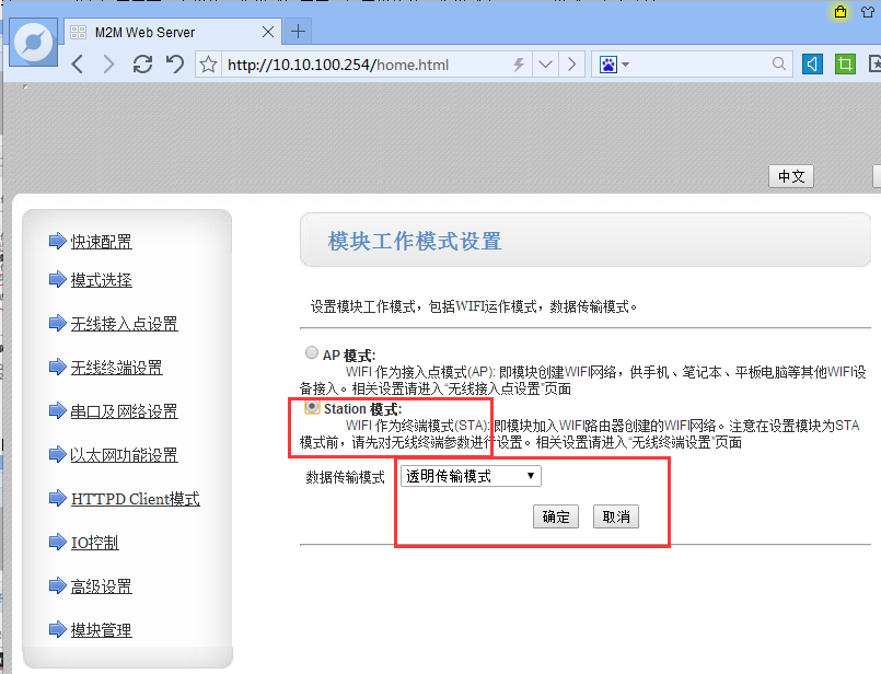 2:在電腦瀏覽器上輸入10.10.100.254.用戶名和密碼都是默認(rèn)admin。進(jìn)入設(shè)置界面,在模塊工作模式設(shè)置里,設(shè)置模塊的工作模式為station模式,點(diǎn)擊確認(rèn)。