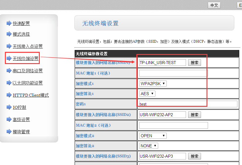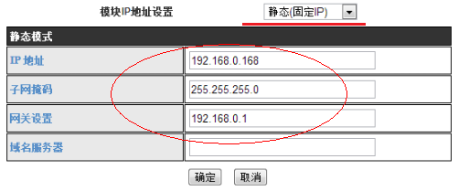 3:設(shè)置模塊連入無(wú)線路由器。在無(wú)線終端設(shè)置中,搜索要連的路由器的SSID ,確認(rèn)后,輸入無(wú)線密碼,點(diǎn)擊確認(rèn)。模塊IP地址設(shè)置為靜態(tài)IP.