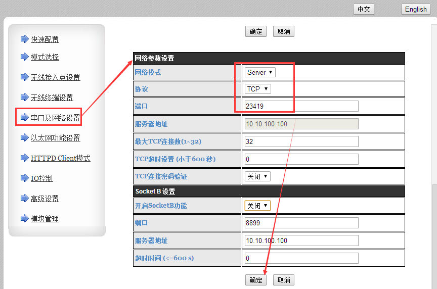 4:在串口及其他設(shè)置中,串口設(shè)置根據(jù)用戶設(shè)備更改設(shè)置。在網(wǎng)絡(luò)參數(shù)設(shè)置中,網(wǎng)絡(luò)模式設(shè)置為T(mén)CP Server .端口號(hào)設(shè)置為23419。點(diǎn)擊確認(rèn)