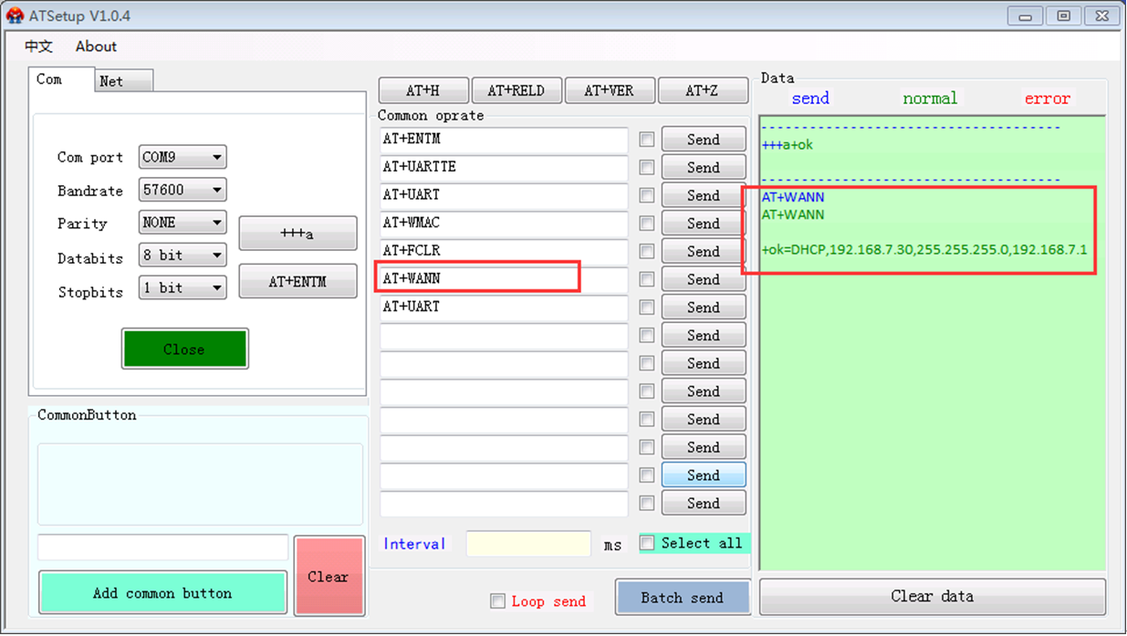 2>發(fā)送AT+WANN就可以查詢wifi模塊的WAN IP地址了;通過這個軟件也可以設(shè)置/查詢wifi模塊的其他參數(shù),全面的AT指令見相關(guān)產(chǎn)品的軟件設(shè)計(jì)手冊。
