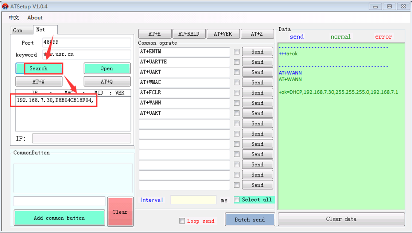 安裝上述軟件的PC和wifi模塊接到同一個路由器下,打開Net選項(xiàng)卡,點(diǎn)擊search,能夠搜索到wifi模塊的IP以及MAC信息的,見下圖