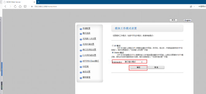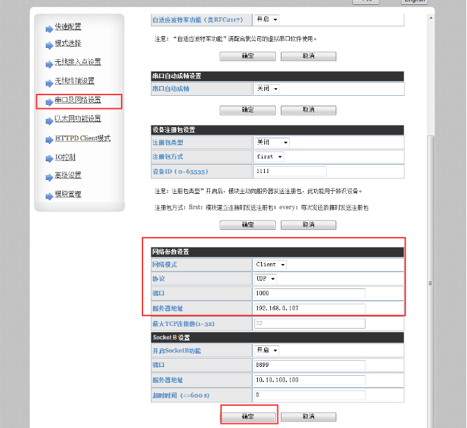 4、登錄設(shè)置網(wǎng)頁,設(shè)置為串口指令模式,點擊確定;串口及網(wǎng)絡(luò)設(shè)置,設(shè)置成UDP Client,目標(biāo)IP192.168.0.107,目標(biāo)端口1000。模塊管理,重啟。